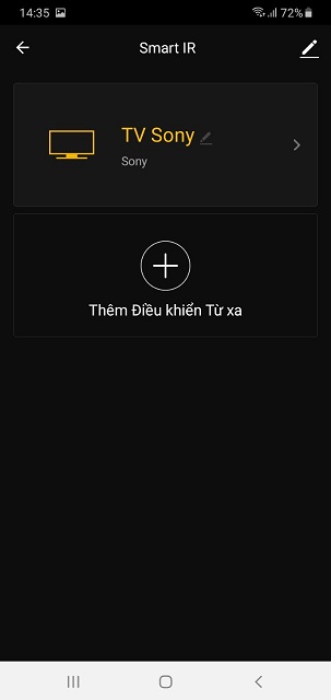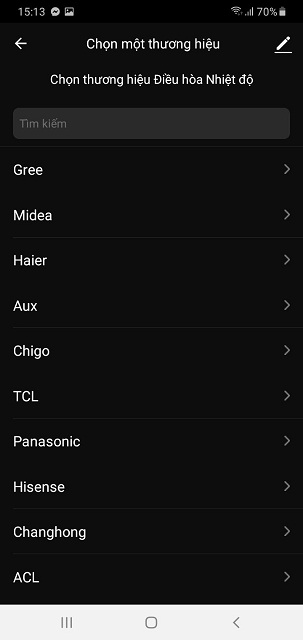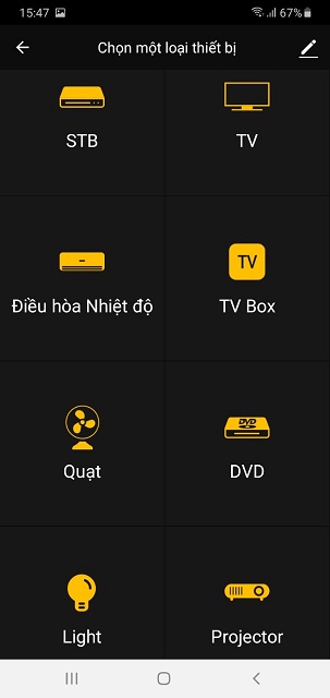 - Chọn danh mục và tên thương hiệu thiết bị muốn điều khiển (ví dụ: Tivi Samsung, Điều hòa Panasonic, Quạt Midea).