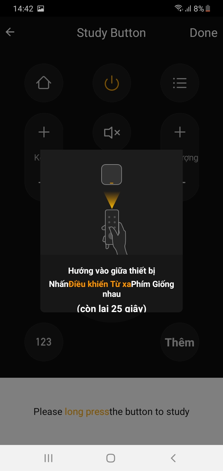 - Nhấn giữ phím On/Off trên remote hướng vào Tuya S06 cho đến khi app báo Detected signal.
