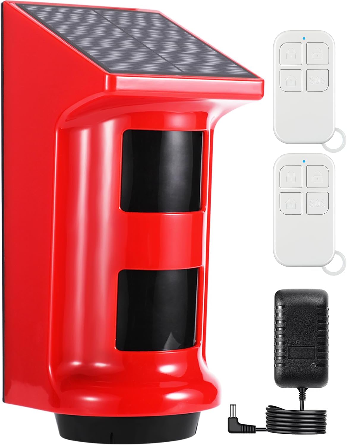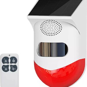 Còi báo động không dây ngoài trời. Âm thanh 120dB + đèn flash LED. Sạc pin năng lượng mặt trời, chống nước IP65. Kết nối 433MHz tương thích với các host báo trộm không dây.