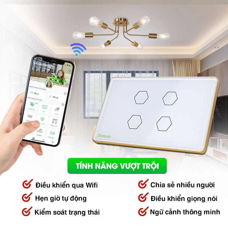 Công tắc cảm ứng Hunonic Luxury hình chữ nhật viền vàng