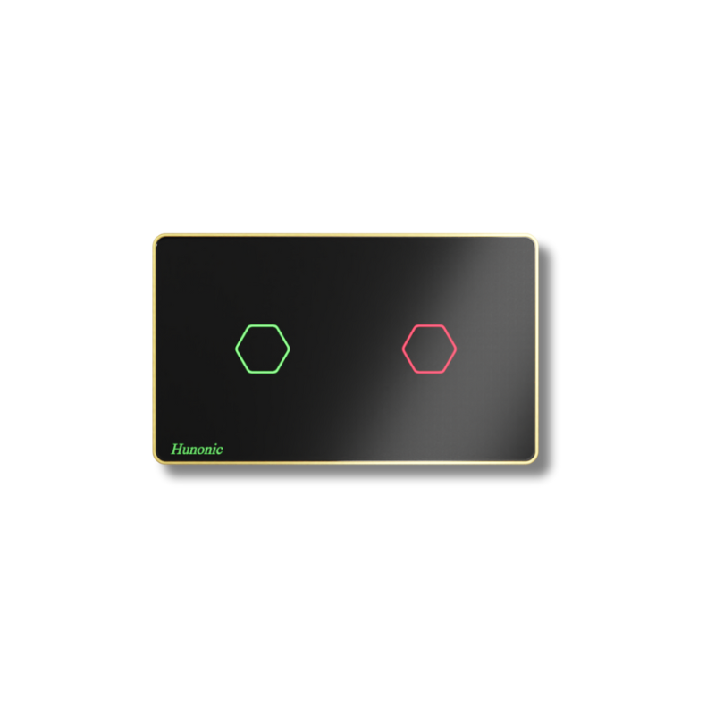 Công tắc cảm ứng Hunonic Luxury với thiết kế hình chữ nhật tinh tế và viền vàng sang trọng mang lại cảm giác hiện đại và đẳng cấp cho không gian sống. Độ bền cao, cảm ứng mượt mà và khả năng điều khiển đa dạng giúp bạn tạo nên bầu không khí ấm cúng, tiện nghi và phong cách riêng.