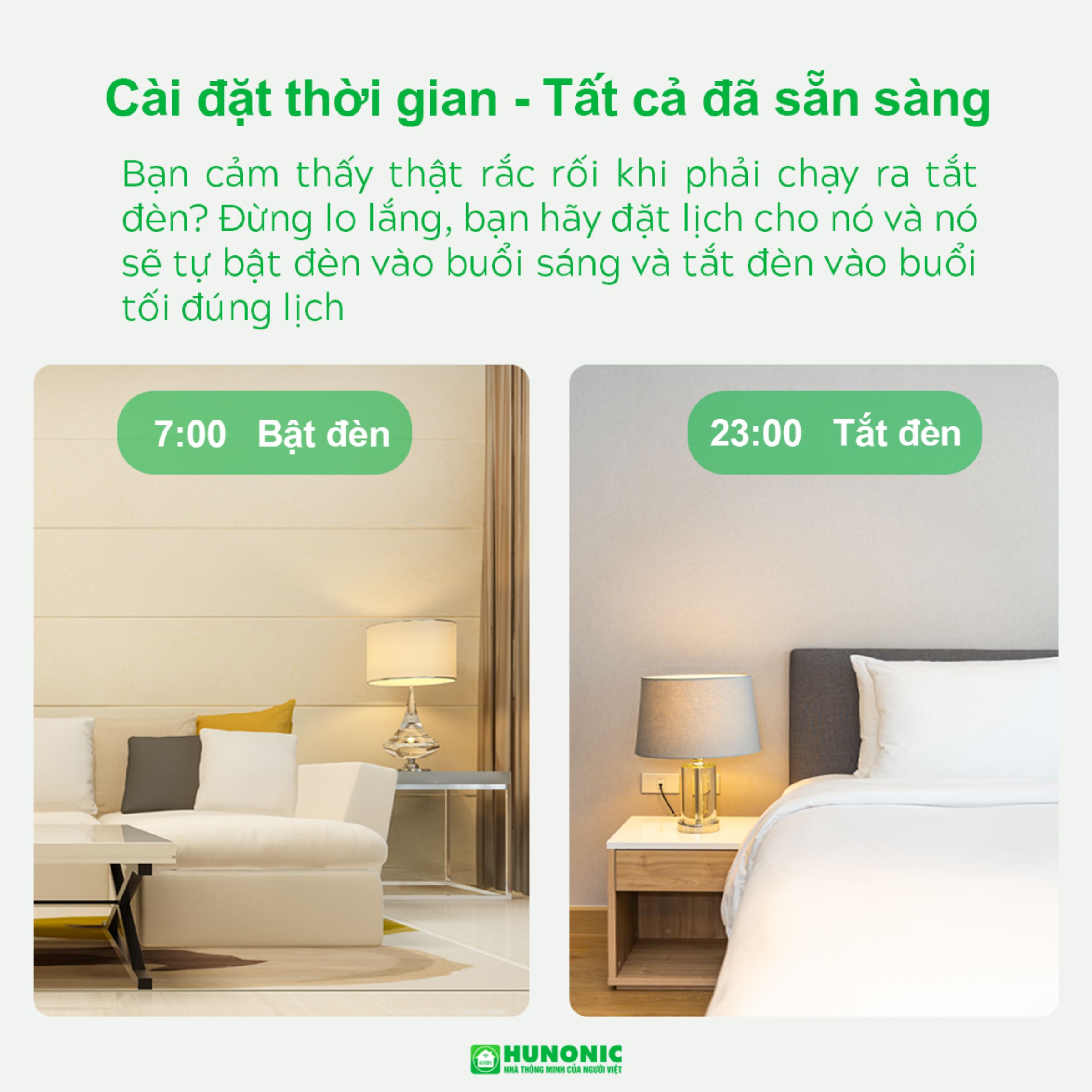 - Hẹn giờ và lập lịch – tự động bật/tắt đèn, quạt, bình nóng lạnh theo thời gian quy định.