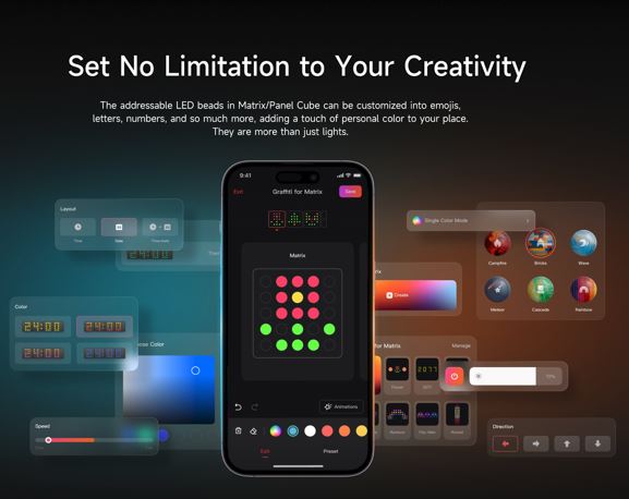 - 3 Module chiếu sáng – Cube Matrix (5×5 ARGB), Cube Panel (bảng chiếu sáng mượt mà), Cube Spot (điểm chiếu RGB 15°).