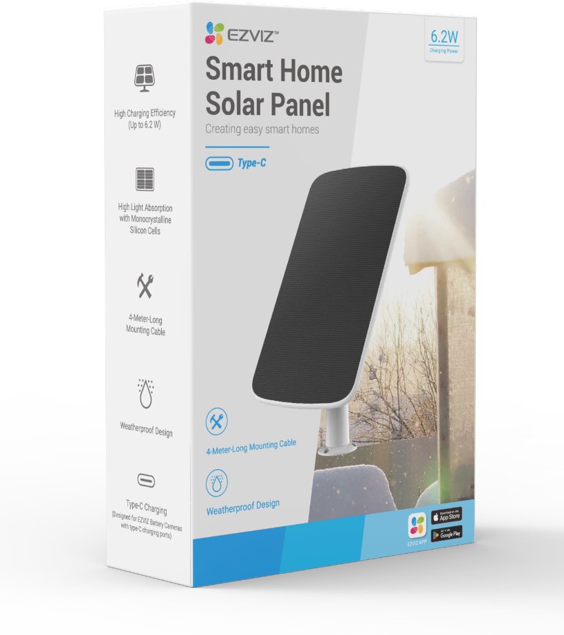 EZVIZ Solar Panel-E là phụ kiện tấm pin mặt trời cao cấp hơn với công suất 6.18W và cổng kết nối Type-C hiện đại, tương thích với các dòng camera pin mới nhất của EZVIZ.