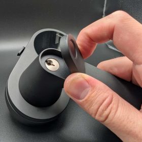 Khóa được chia thành hai nửa: bên ngoài chứa cảm biến, bàn phím và cổng loa; bên trong chứa pin AA và nút tự động khóa.